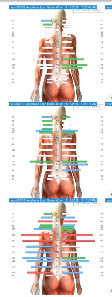 On Monday, I had my third set of progress scans with the chiropractor, and the results were honestly incredible. Comparing my original scans from October to my current ones, I can hardly believe how much progress I’ve made in such a short amount of time.